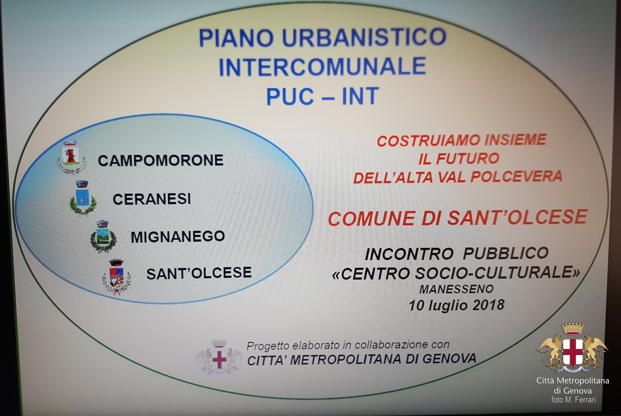 Incontro con i cittadini del comune di Sant'Olcese per parlare del futuro del comune per quanto riguarda il PUC (piano urbanistico comunale). Iniziative di divulgazione e trasparenza aperte a tutta la popolazione. nell’ambito del progetto del PUC intercomunale di Città metropolitana di Genova
